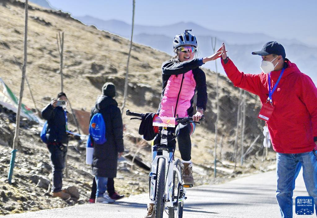 1月1日,在西藏拉薩市,一名參賽者在抵達自行車(chē)爬坡比賽終點(diǎn)后慶祝。