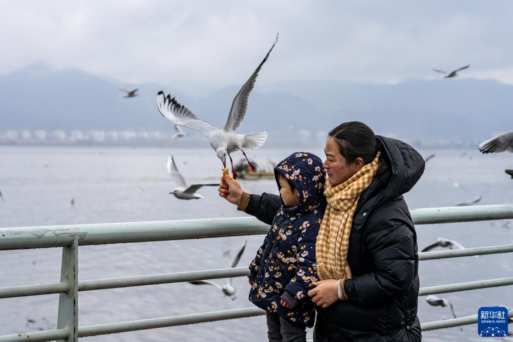 1月1日,游客在云南昆明滇池海埂大壩投喂紅嘴鷗。