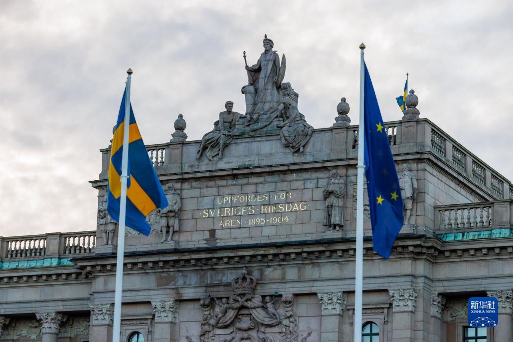1月1日,在瑞典首都斯德哥爾摩,瑞典議會(huì )大樓外懸掛瑞典國旗和歐盟旗幟。