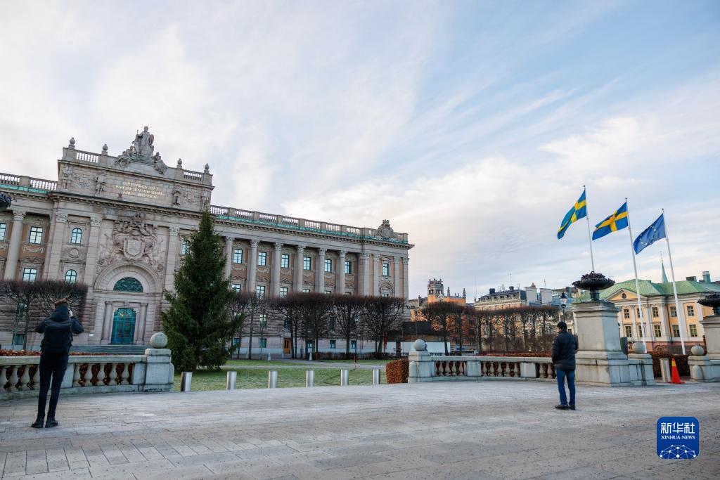 1月1日,在瑞典首都斯德哥爾摩,瑞典議會(huì )大樓外懸掛瑞典國旗和歐盟旗幟。