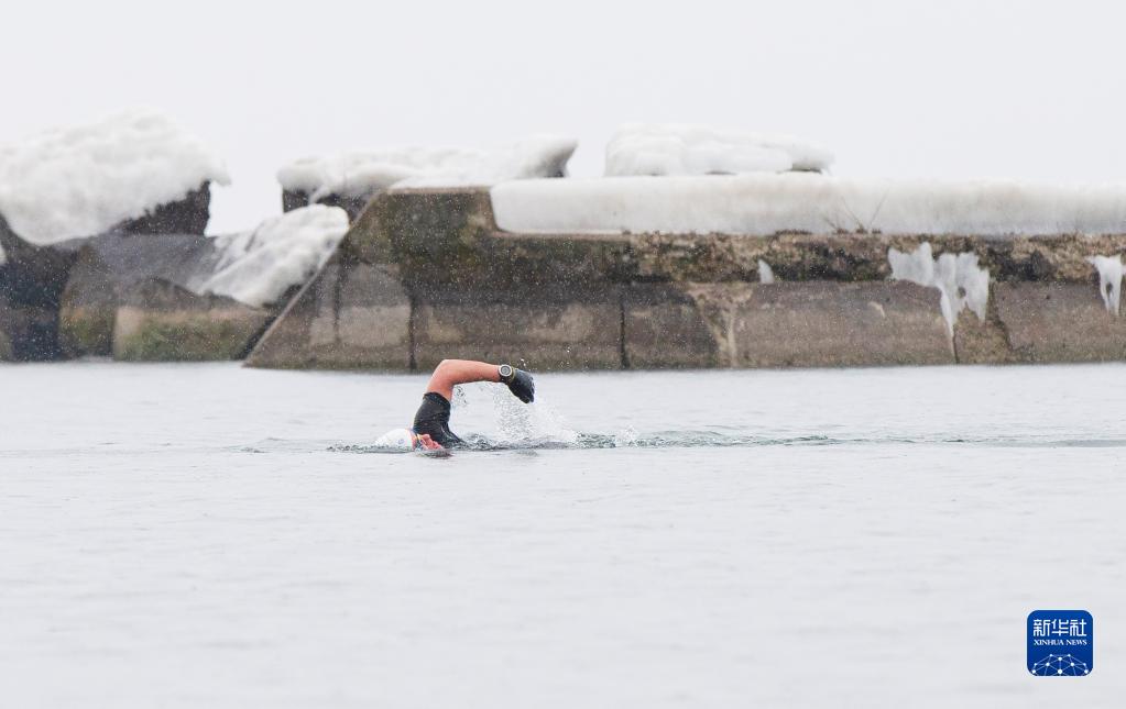 1月1日,在加拿大多倫多,一名冬泳活動(dòng)參與者在安大略湖中游泳。