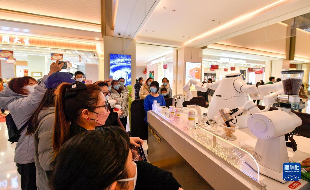1月1日,消費者在位于天津市河東區的金茂匯商場(chǎng)內排隊購買(mǎi)機器人制作的咖啡。