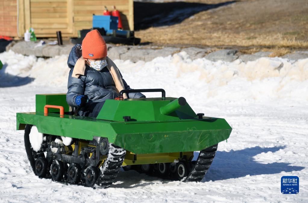 1月2日,一名小朋友在北京玉淵潭公園體驗“雪地小坦克”。