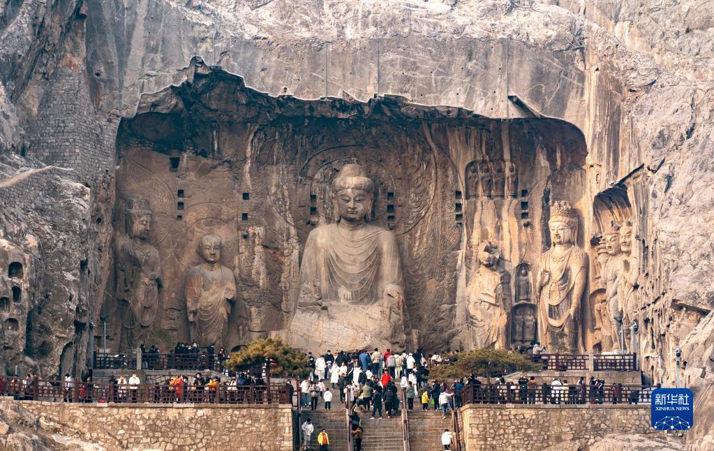 2023年1月2日,游客在洛陽(yáng)市龍門(mén)石窟景區內游玩。