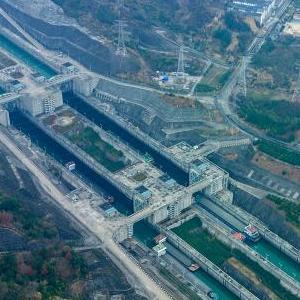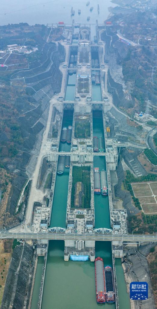1月2日,在湖北省宜昌市,船舶正有序通過(guò)三峽樞紐五級船閘(無(wú)人機照片)。