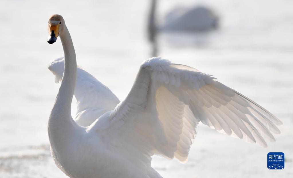1月2日,大天鵝在三河口天鵝灘濕地嬉戲。