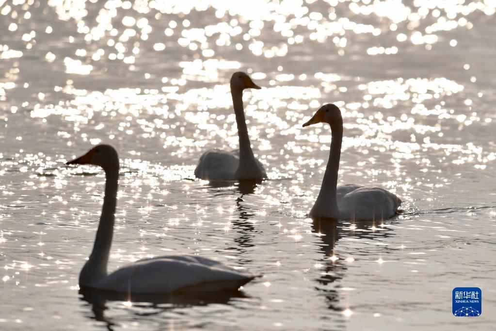 1月2日,大天鵝在三河口天鵝灘濕地的水面上游弋。