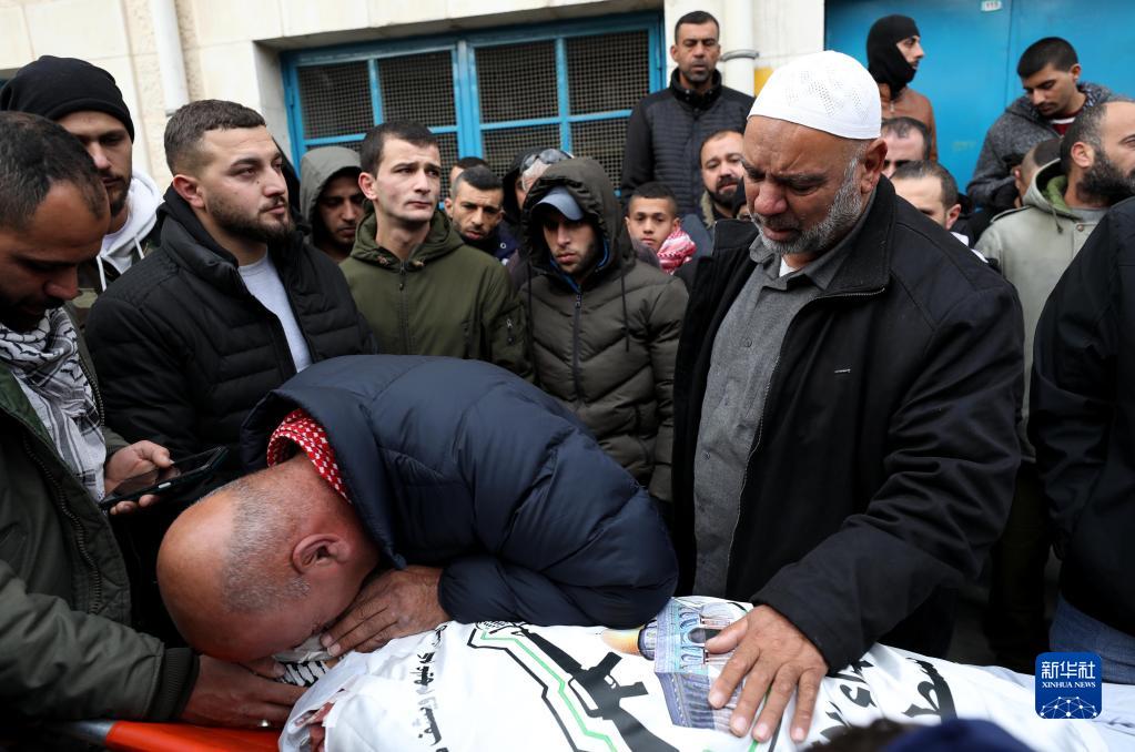 1月2日,在約旦河西岸北部城市杰寧,人們在被以色列軍隊打死的巴勒斯坦人遺體邊哀悼。