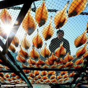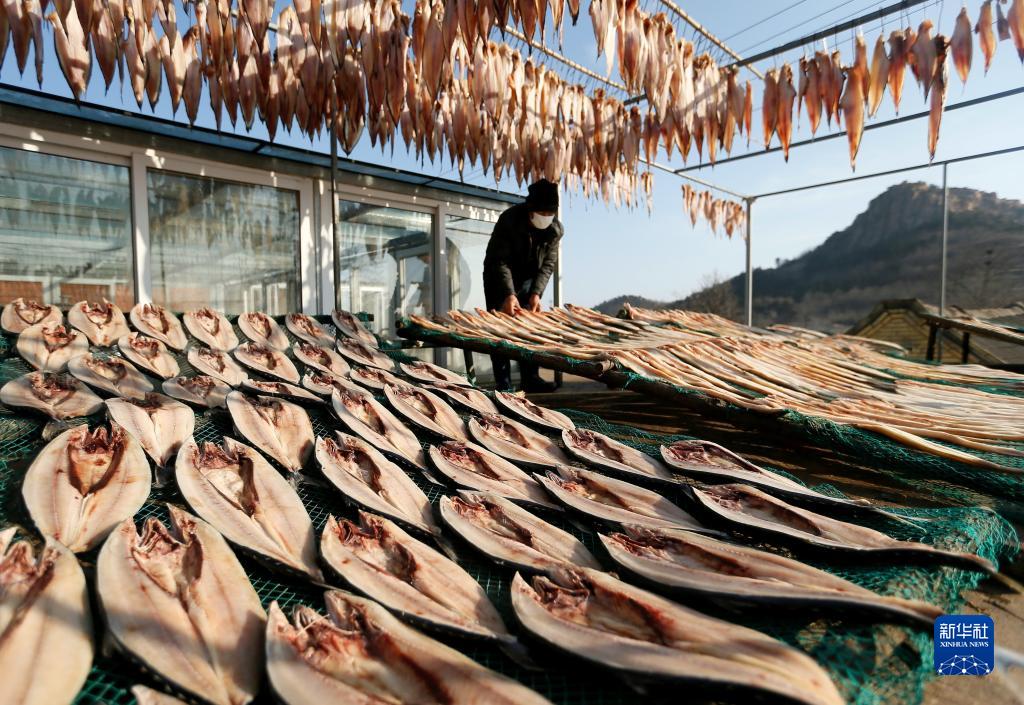 春節臨近,山東省青島市即墨區鰲山衛街道的漁民利用晴好天氣,將捕獲的海魚(yú)進(jìn)行切割、腌制、晾曬,加工成魚(yú)干,供應節日市場(chǎng)。