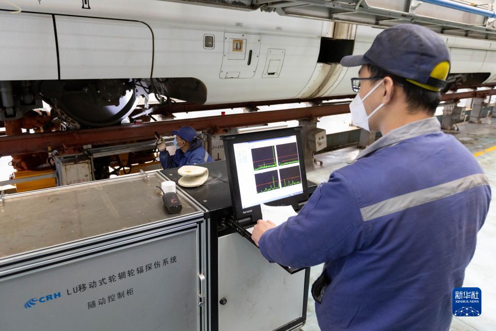 1月3日,在上海虹橋動(dòng)車(chē)運用所,探傷工(右)對動(dòng)車(chē)組輪輞輪輻進(jìn)行探傷作業(yè)。