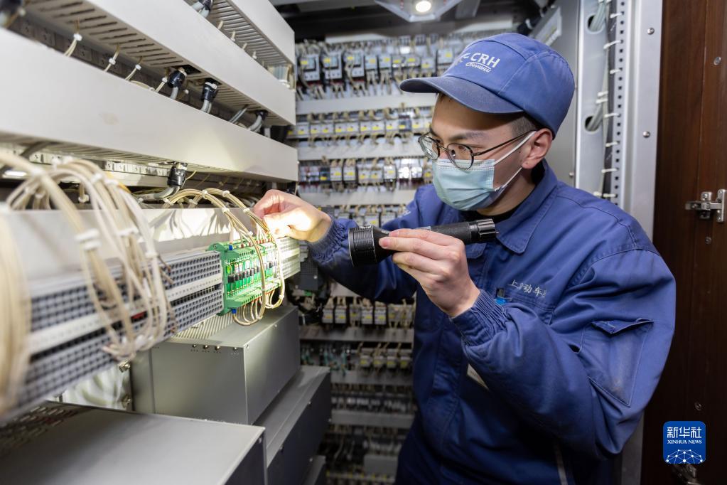 1月3日,動(dòng)車(chē)組機械師上海虹橋動(dòng)車(chē)運用所檢查列車(chē)電氣柜內接線(xiàn)。