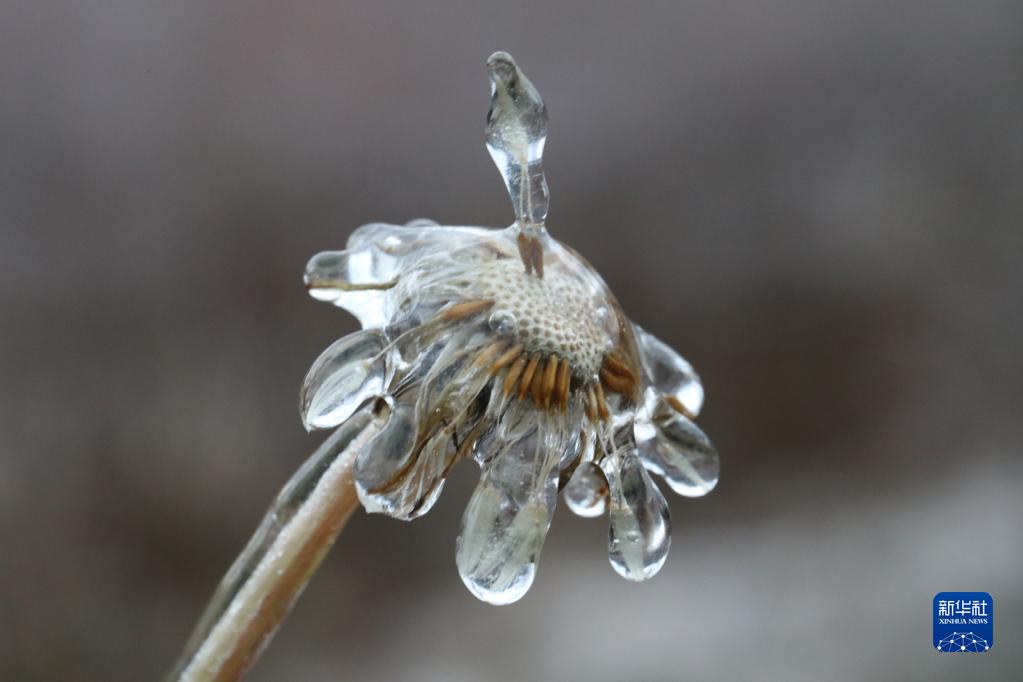 1月2日,在云南省騰沖市打鷹山中,一株枯萎的蒲公英上結了冰。