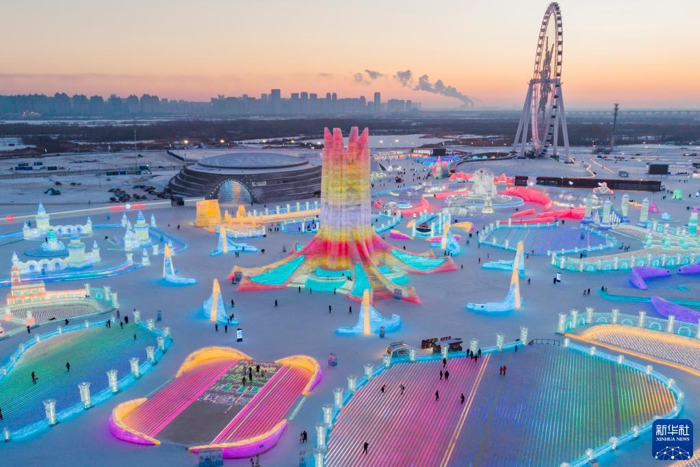 冬日夕陽(yáng)下,第24屆哈爾濱冰雪大世界園區流光溢彩,夢(mèng)幻壯觀(guān),來(lái)自天南海北的游客在園區內暢享冰情雪趣。