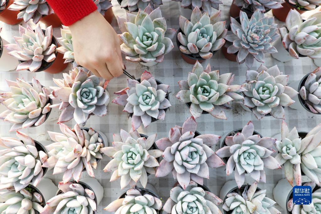 1月4日,在河北省唐山市豐潤區七樹(shù)莊鎮七樹(shù)莊村,村民在大棚里管護多肉植物。
