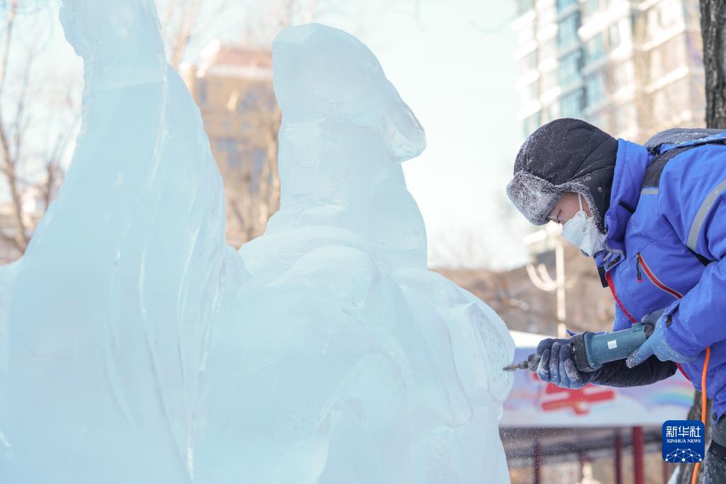 1月4日,在哈爾濱冰燈藝術(shù)游園會(huì )園區,冰雕師在進(jìn)行冰雕藝術(shù)作品創(chuàng )作。