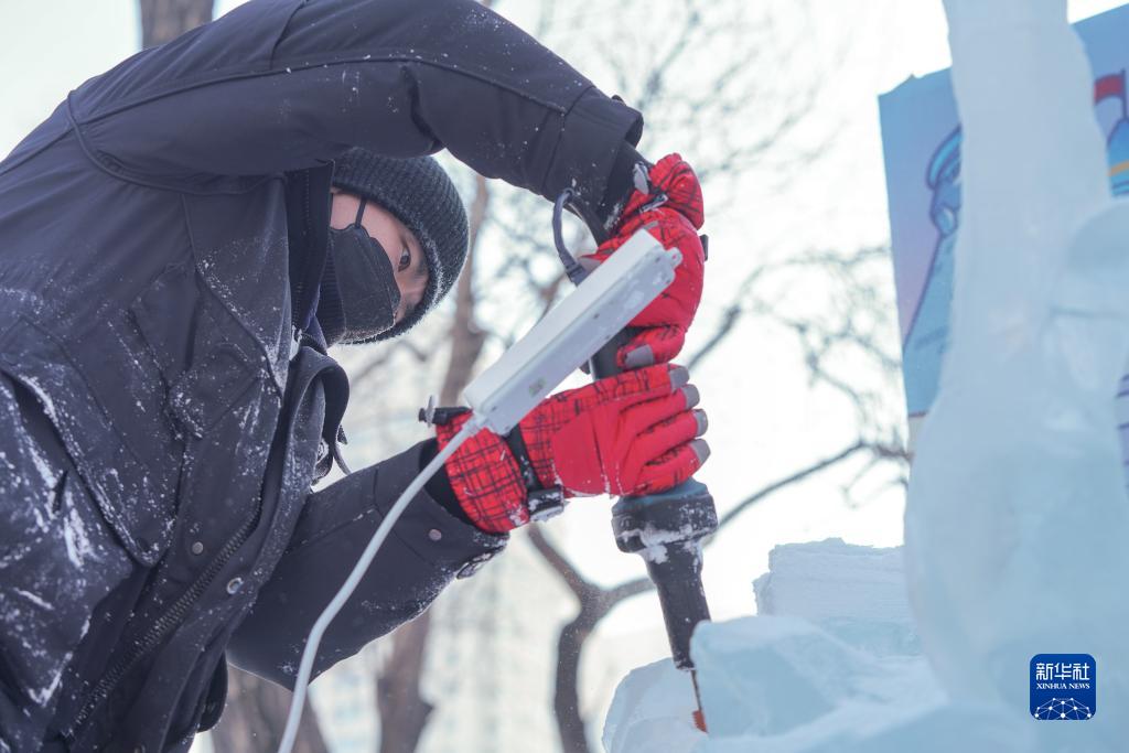 1月4日,在哈爾濱冰燈藝術(shù)游園會(huì )園區,冰雕師在進(jìn)行冰雕藝術(shù)作品創(chuàng )作。