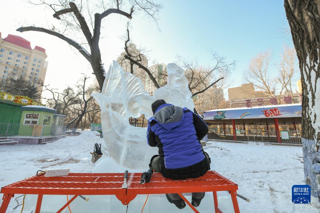 1月4日,在哈爾濱冰燈藝術(shù)游園會(huì )園區,冰雕師在進(jìn)行冰雕藝術(shù)作品創(chuàng )作。