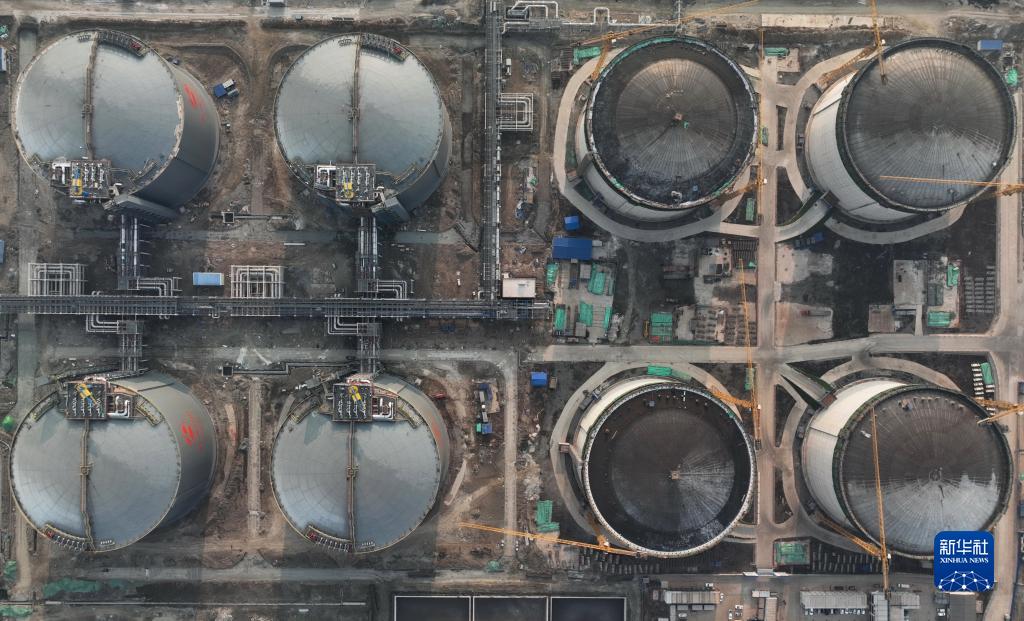 1月4日拍攝的唐山市曹妃甸區新天LNG(液化天然氣)項目接收站工程建設工地(無(wú)人機照片)。