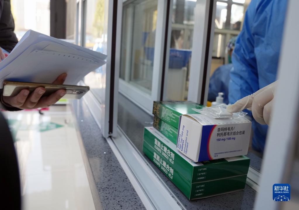 1月4日,在上海市松江區九亭鎮社區衛生服務(wù)中心發(fā)熱門(mén)診,藥房人員在窗口向患者家屬發(fā)藥。