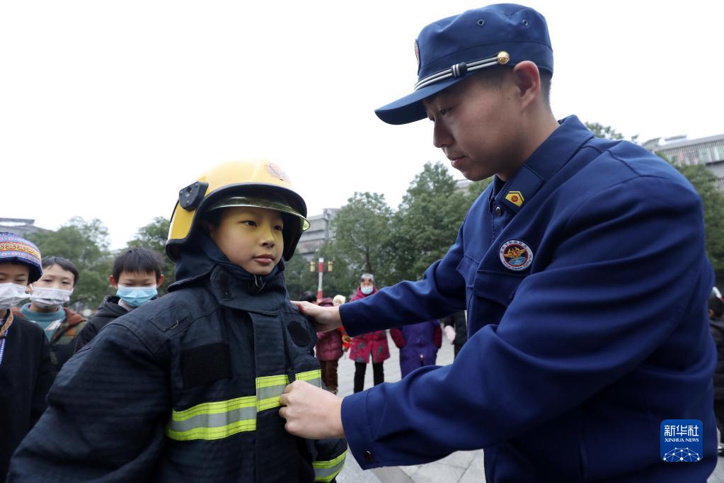 1月4日,在資興市唐洞街道茶坪瑤族村,小朋友在消防員的幫助下試穿滅火救援服。