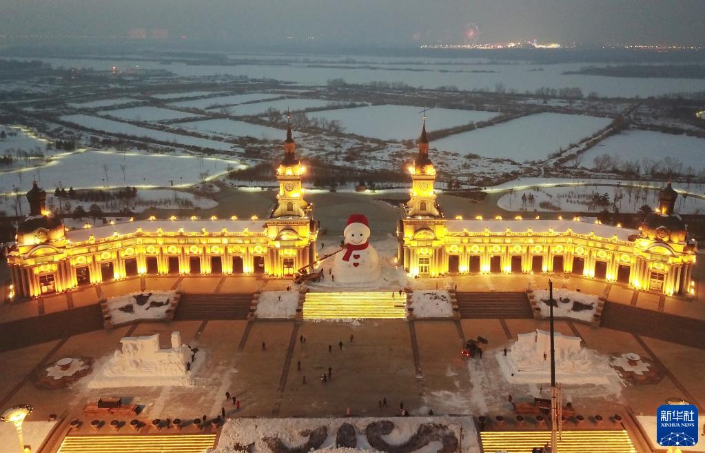 1月4日,在哈爾濱松花江畔,工人進(jìn)行大雪人收尾工作(無(wú)人機照片)。
