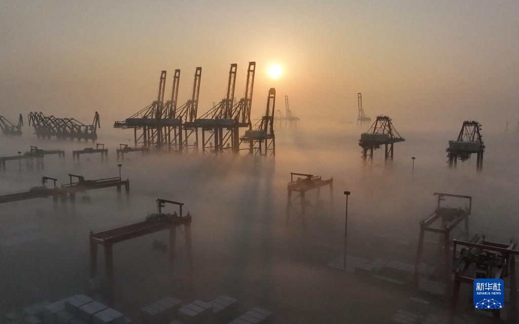 平流霧中的唐山港京唐港區景色(1月5日攝,無(wú)人機照片)。