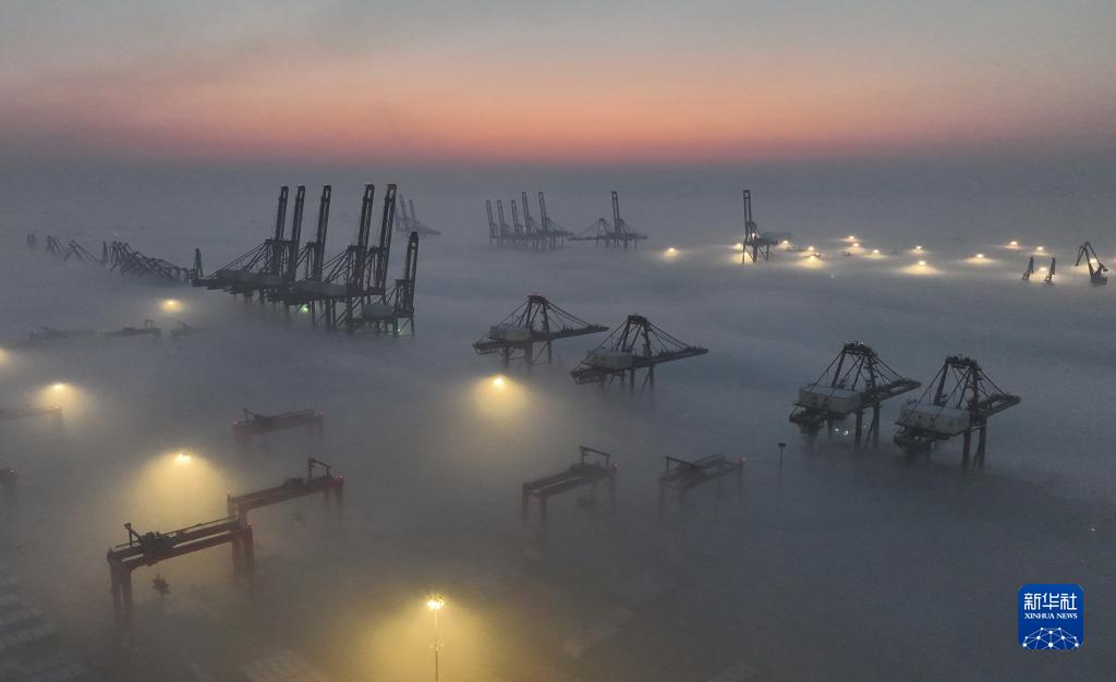 平流霧中的唐山港京唐港區景色(1月5日攝,無(wú)人機照片)。