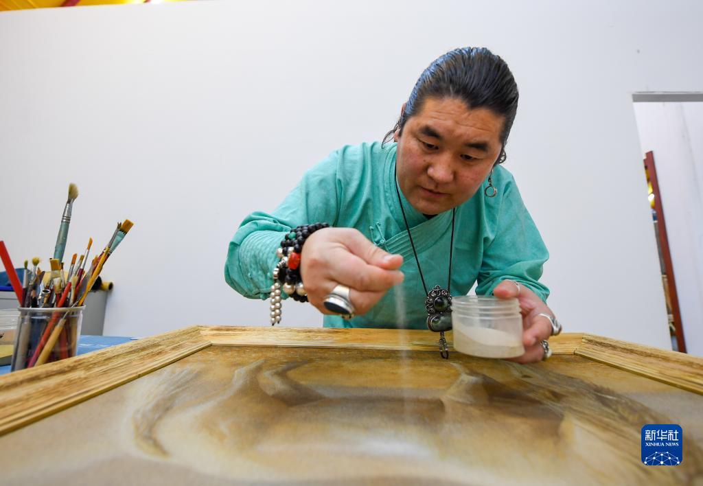 1月4日,阿拉騰畢力格在工作室內創(chuàng )作沙畫(huà)。