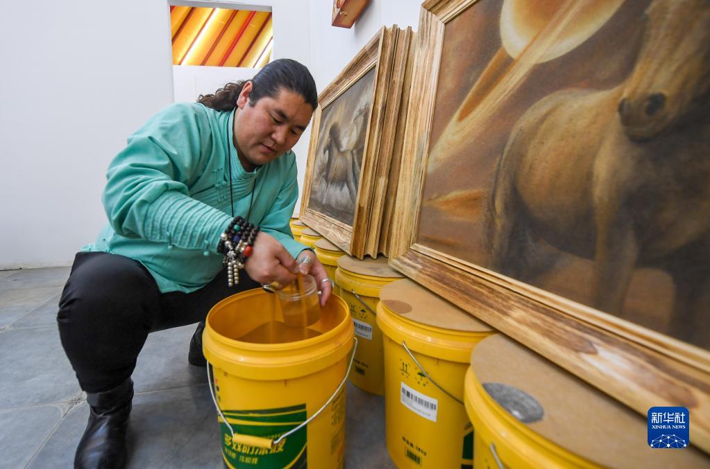 內蒙古錫林郭勒盟正藍旗位于渾善達克沙地腹地,生活于此的80后蒙古族青年阿拉騰畢力格取沙為材,進(jìn)行沙畫(huà)藝術(shù)作品創(chuàng )作。他對渾善達克沙地中顏色各異的沙粒進(jìn)行淘洗、篩選、清理雜質(zhì)、曬干等操作后,加上用糯米汁、牛角等材料熬制而成的天然膠水,就能使各色沙粒在充分粘貼的情況下,依然保持其色彩。他的沙畫(huà)作品色彩自然、造型古樸,獨具特色。