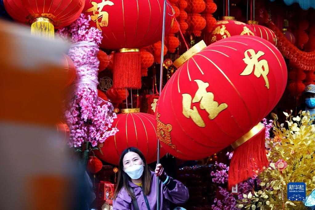 1月5日,在廣西南寧市上海路的年貨市場(chǎng),銷(xiāo)售人員在幫顧客挑選大紅燈籠。