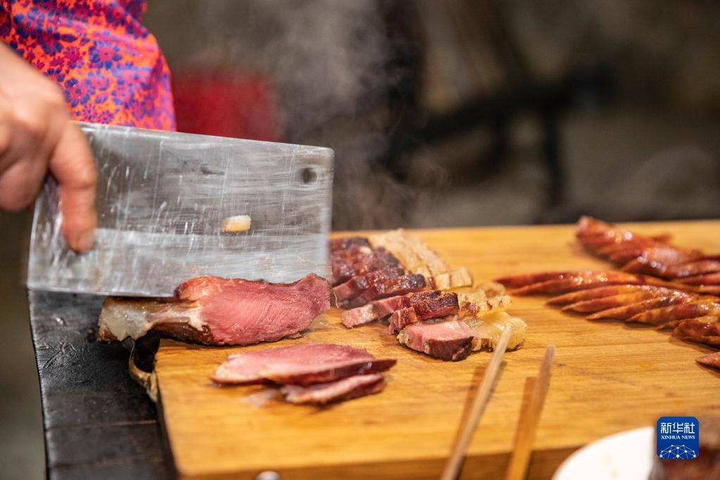 1月4日,在重慶市城口縣厚坪鄉紅色村,村民何宜香將煮好的城口老臘肉切片。