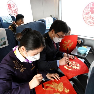當日,中國鐵路上海局集團有限公司合肥客運段組織工作人員,將G8341次列車(chē)裝扮一新,在列車(chē)上舉辦“情暖回家路”主題活動(dòng)。猜謎語(yǔ)、演唱黃梅戲、手寫(xiě)福字送祝福,讓乘客在旅途中感受節日氛圍。