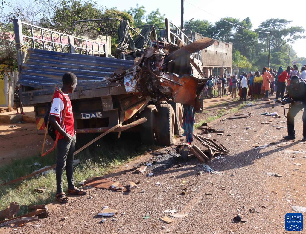 1月6日,在烏干達首都坎帕拉通往古盧的公路旁,人們查看事故現場(chǎng)。