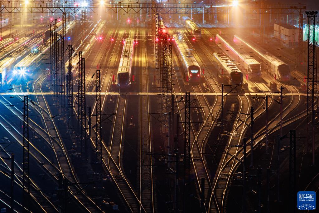 1月7日,2023年春運啟動(dòng)。1月6日晚,在中國鐵路成都局集團有限公司貴陽(yáng)北動(dòng)車(chē)所,??吭诖孳?chē)線(xiàn)上的動(dòng)車(chē)排列整齊如同一支“陸地艦隊”。