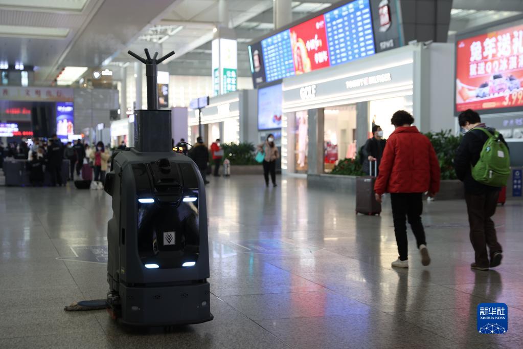 1月7日,集消毒、保潔于一體的清掃機器人在上海虹橋火車(chē)站進(jìn)行自動(dòng)化消毒作業(yè)。