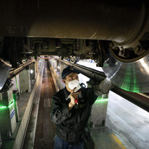 1月6日,工作人員在檢查動(dòng)車(chē)組列車(chē)的輪對。