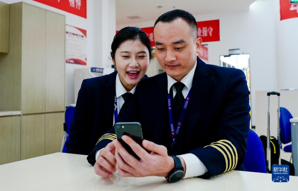 1月6日,重慶航空的機組工作區內,出任務(wù)的楊靜(左)和丈夫菅士博與孩子視頻通話(huà)。