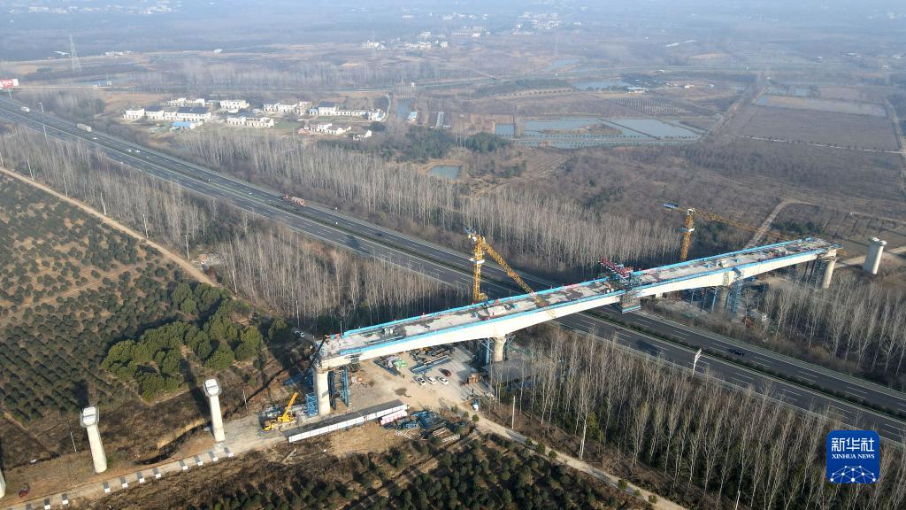 這是完成合龍施工的合新鐵路安徽段跨滬陜高速連續梁(1月7日,無(wú)人機照片)。