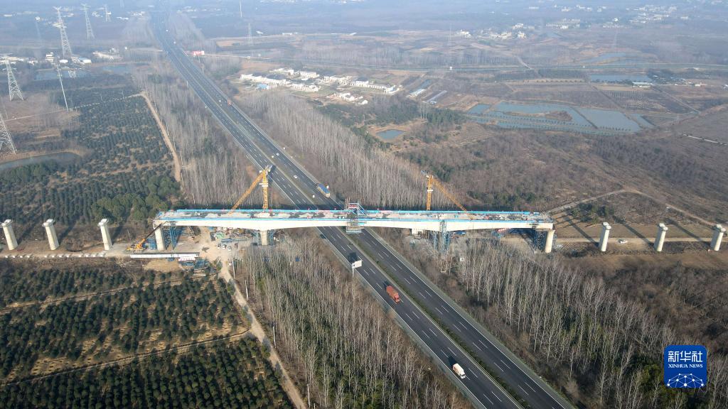 這是完成合龍施工的合新鐵路安徽段跨滬陜高速連續梁(1月7日,無(wú)人機照片)。