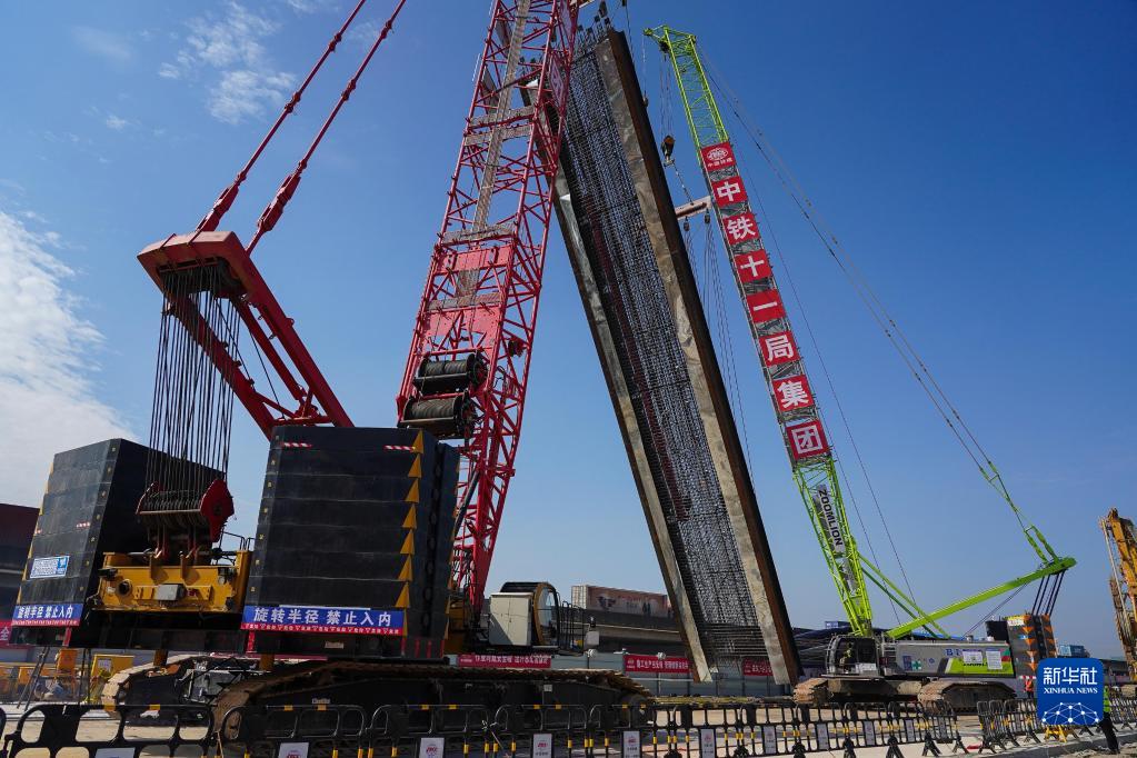 1月7日,在深江鐵路深莞隧道西段出口明挖隧道施工現場(chǎng),兩臺吊機配合著(zhù)將首幅地連墻鋼筋籠抬吊至垂直位置。