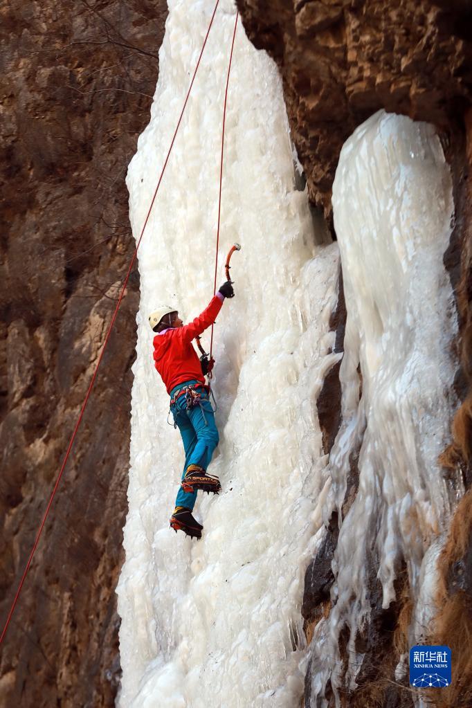 近日,河北邢臺市云夢(mèng)山景區內的七疊瀑形成壯觀(guān)冰壁,吸引不少游客前來(lái)游玩。攀冰愛(ài)好者借助專(zhuān)業(yè)工具,在專(zhuān)職教練的指導下體驗攀冰,成為太行山冬日里一道別樣風(fēng)景。