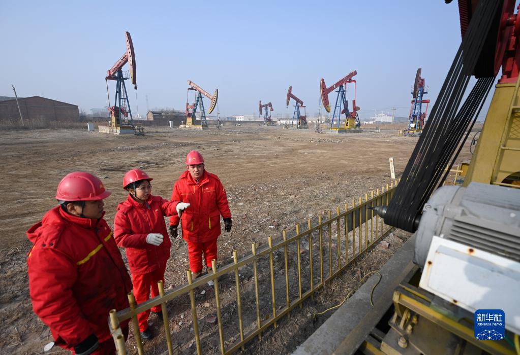 尤立紅(中)和同事在大港油田第五采油廠(chǎng)第一采油作業(yè)區查看抽油機皮帶磨損情況(1月6日攝)。