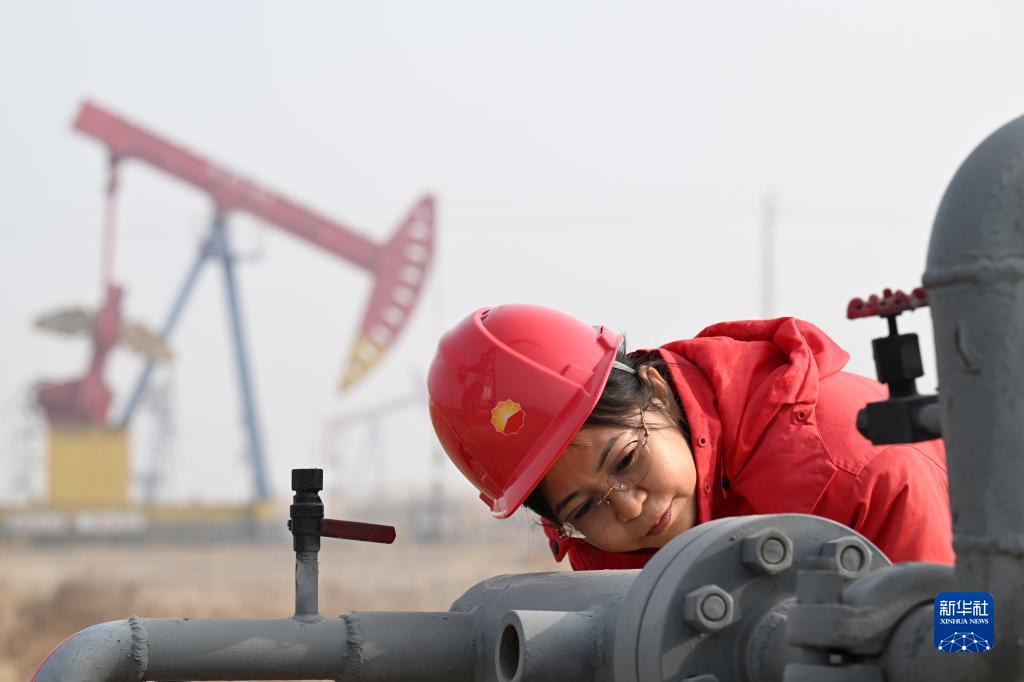 尤立紅在大港油田第五采油廠(chǎng)第一采油作業(yè)區內通過(guò)聲音辨別設備運行情況(1月6日攝)。