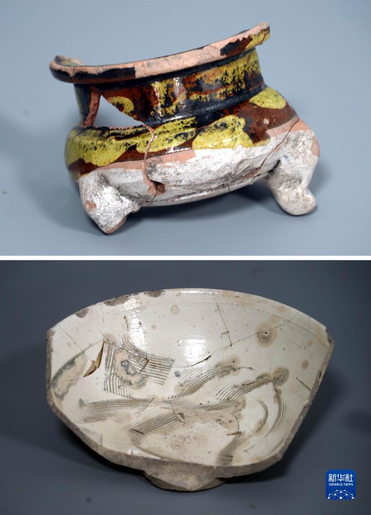 拼版照片:河南商丘宋國故城遺址出土的三彩香爐(上)、白瓷碗(下)(1月6日攝)。