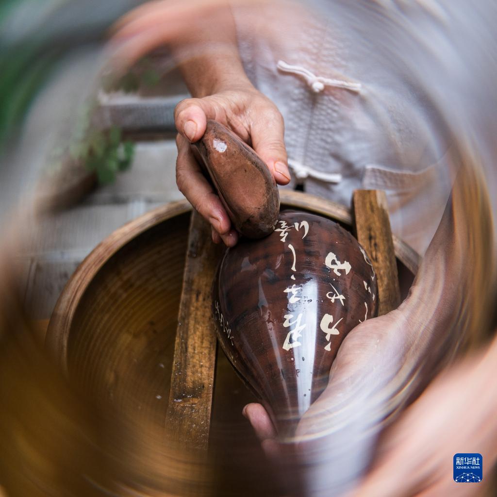 2022年6月30日,生活在云南省紅河哈尼族彝族自治州建水縣碗窯村的紫陶藝人徐榮洪在院落里對紫陶工藝品進(jìn)行無(wú)釉磨光。徐榮洪是當地徐家窯的第五代制陶藝人,也是非遺建水紫陶燒制技藝的傳承人。