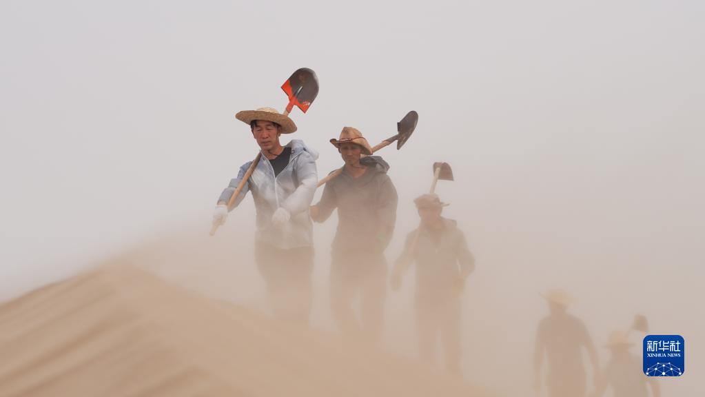 2022年7月3日,在新疆且末縣,張選忠(左一)、田野(左二)等老兵在塔克拉瑪干沙漠里頂風(fēng)前行,對下一步計劃種植區進(jìn)行地形勘查。