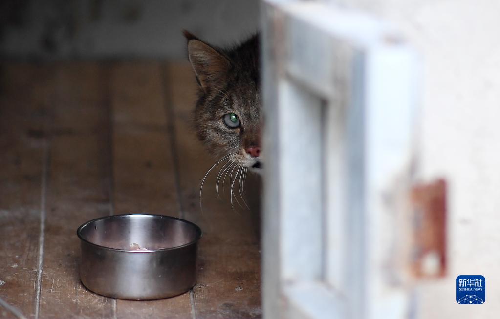 2022年9月18日,受救護的荒漠貓在青海野生動(dòng)物救護繁育中心準備進(jìn)食。