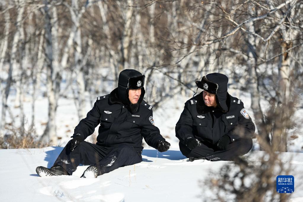 1月9日,西烏珠穆沁旗公安局古日格斯臺國家級自然保護區迪彥派出所民警在巡邏途中休息。