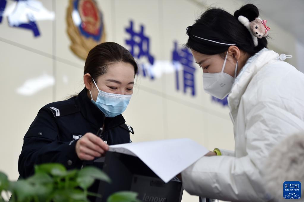 1月10日,在石家莊市公安局鹿泉分局戶(hù)政服務(wù)大廳,女警為前來(lái)辦理戶(hù)籍業(yè)務(wù)的群眾提供服務(wù)。
