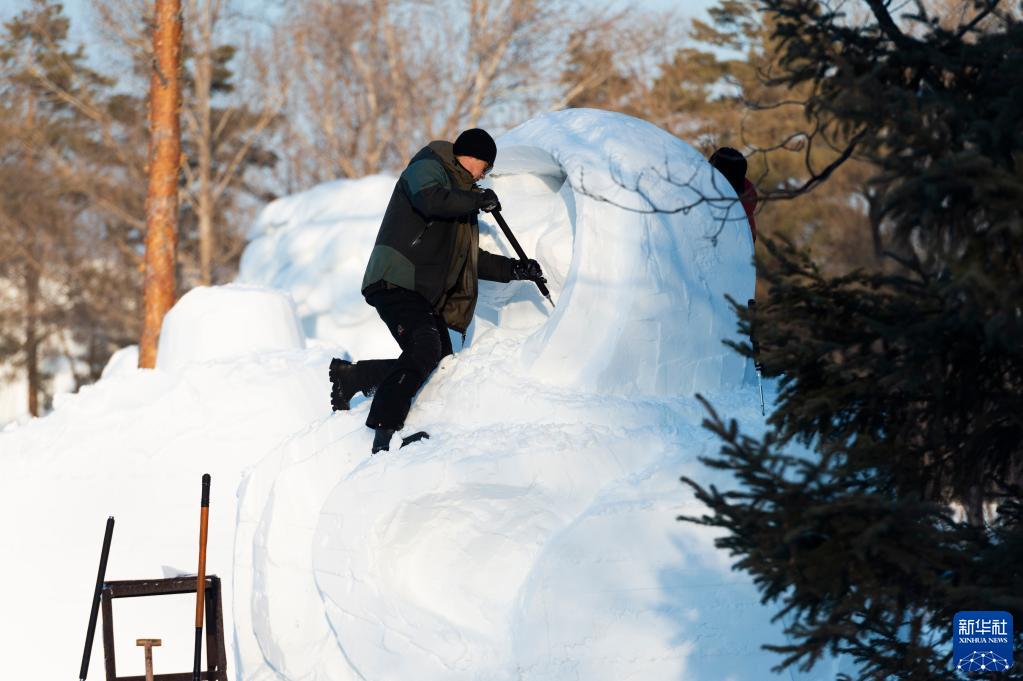 1月10日,在哈爾濱太陽(yáng)島雪博會(huì )園區,參賽選手進(jìn)行雪雕創(chuàng )作。